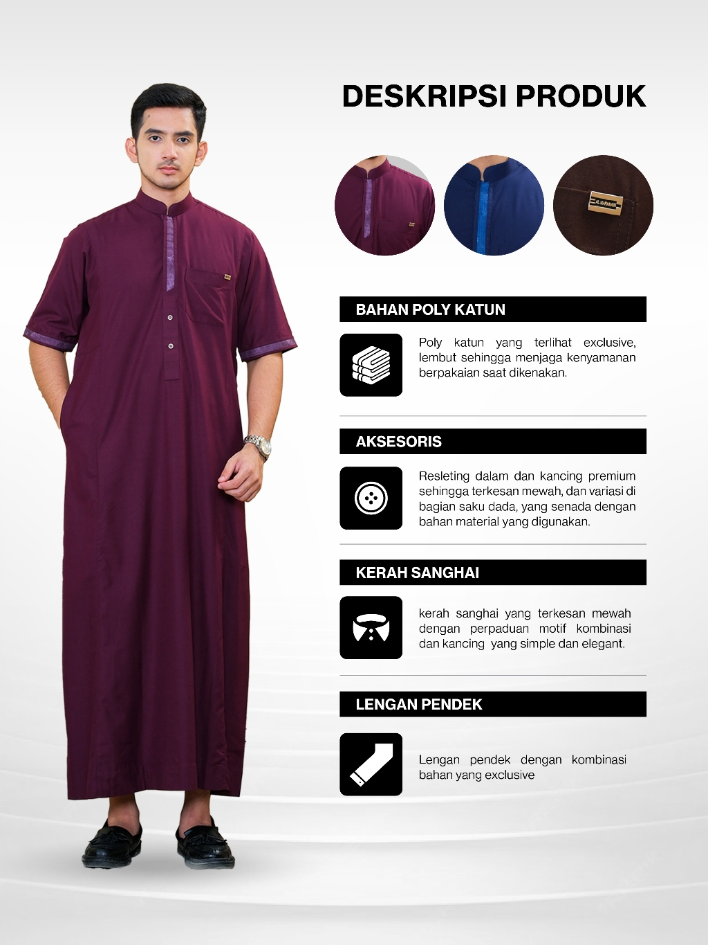 Insyaa Allah Gamis Al-Haramain dibuat dengan bahan yang lembut dan tebal yang akan memberikan kenyamanan saat dikenakan baik saat beribadah maupun aktifitas sehari-hari. Selain itu, Gamis Al-Haramain didesain eksklusif dan mewah untuk menunjang kepercayaan diri juga ditambah dengan jahitan yang kuat untuk menjamin kepuasan Anda.