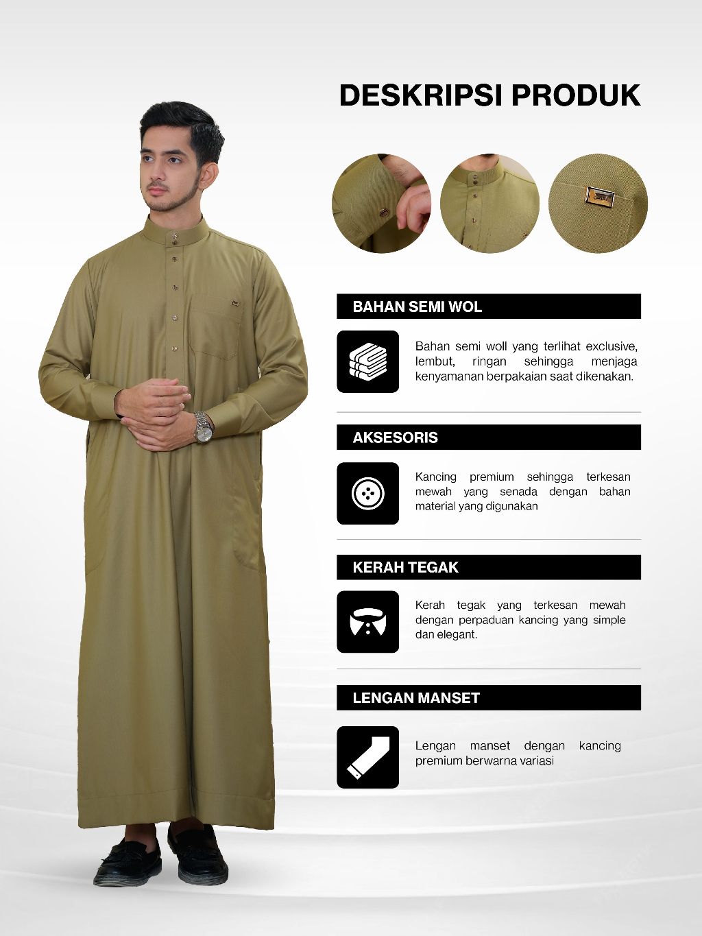 Dibuat dengan bahan katun Semi Wol, jubah ini menghadirkan perpaduan sempurna antara kualitas terbaik dan desain yang elegant. Bahannya lembut, sejuk, dan nyaman dipakai, sehingga ideal untuk menemani ibadah dan aktivitas sehari-hari Anda.