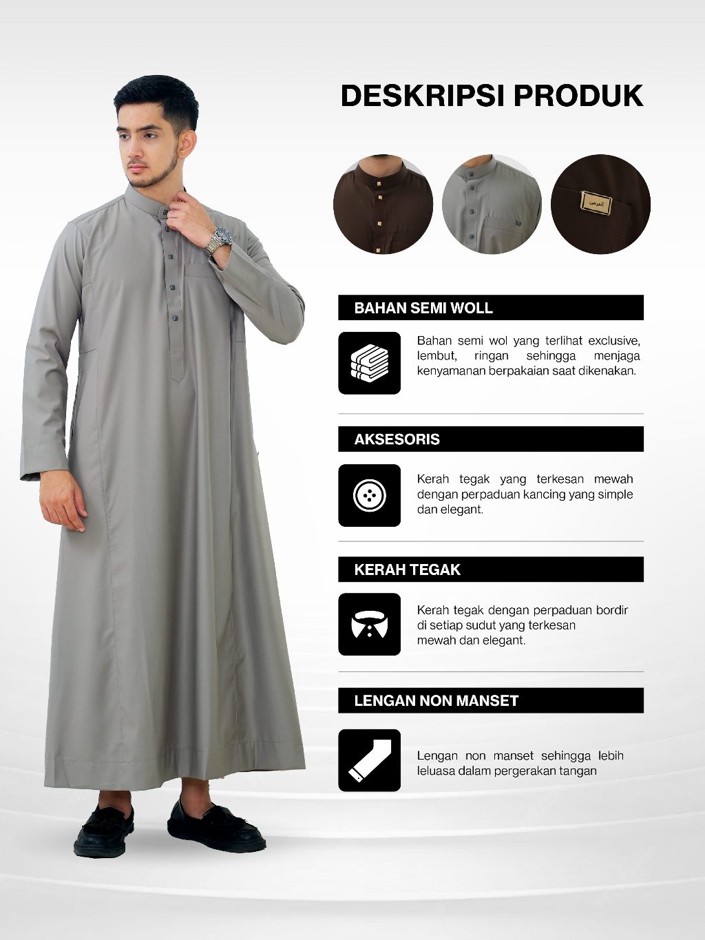 Dibuat dengan bahan Semi Wol, jubah ini menghadirkan perpaduan sempurna antara kualitas terbaik dan desain yang elegant. Bahannya lembut, sejuk, dan nyaman dipakai, sehingga ideal untuk menemani ibadah dan aktivitas sehari-hari Anda.